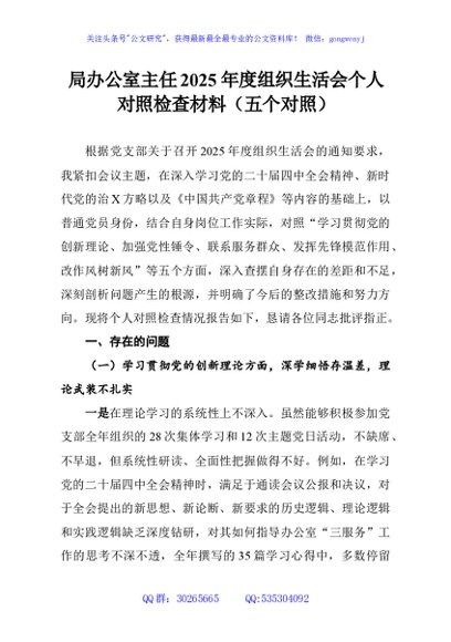 / 局办公室主任2025年度组织生活会个人对照检查材料(五个对照)