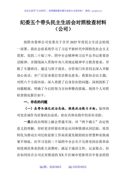 纪委五个带头民主生活会对照检查材料(公司)