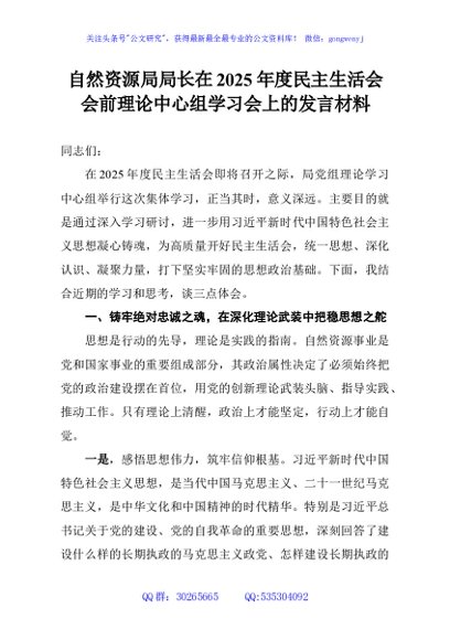 / 自然资源局局长在2025年度民主生活会会前理论中心组学习会上的发言材料