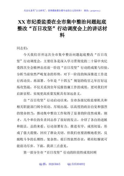 / XX市纪委监委在全市集中整治问题起底整改“百日攻坚”行动调度会上的讲话材料