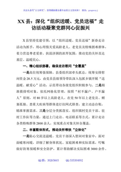 / XX县:深化“组织送暖、党员送福”走访活动凝聚党群同心促振兴
