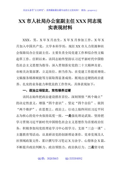 / XX市人社局办公室副主任XXX同志现实表现材料