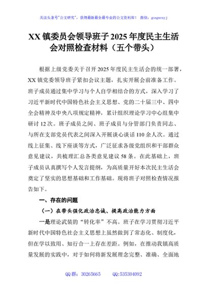 / XX镇委员会领导班子2025年度民主生活会对照检查材料(五个带头)