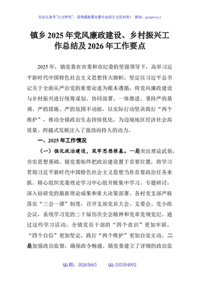 / 镇乡2025年党风廉政建设、乡村振兴工作总结及2026年工作要点
