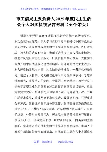 / 市工信局主要负责人2025年度民主生活会个人对照检视发言材料(五个带头)