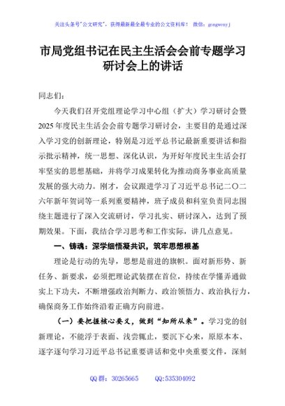 / 市局党组书记在民主生活会会前专题学习研讨会上的讲话