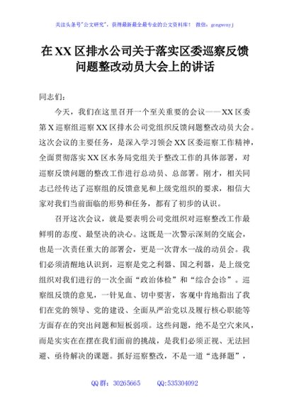 / 在XX区排水公司关于落实区委巡察反馈问题整改动员大会上的讲话