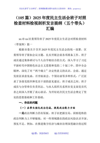 / (105篇)2025年度民主生活会班子对照检查材料检视剖析发言提纲(五个带头)汇编