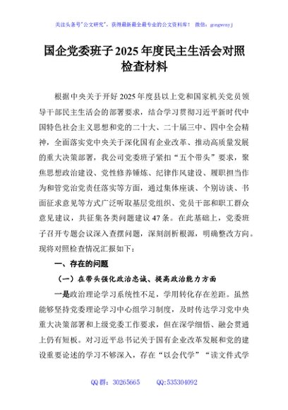/ 国企党委班子2025年度民主生活会对照检查材料