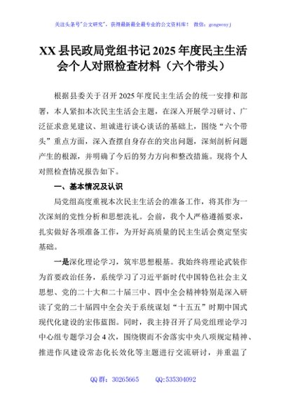 / XX县民政局党组书记2025年度民主生活会个人对照检查材料(六个带头)