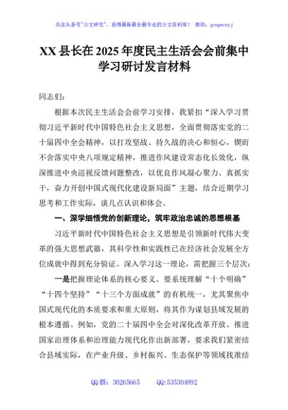 / XX县长在2025年度民主生活会会前集中学习研讨发言材料