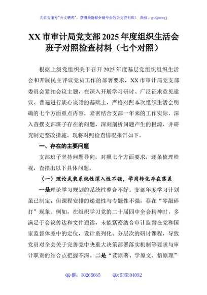 / XX市审计局党支部2025年度组织生活会班子对照检查材料(七个对照)