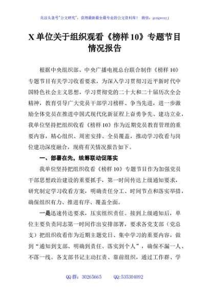 / X单位关于组织观看《榜样10》专题节目情况报告