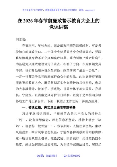 / 在2026年春节前廉政警示教育大会上的党课讲稿