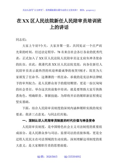 / 在XX区人民法院新任人民陪审员培训班上的讲话