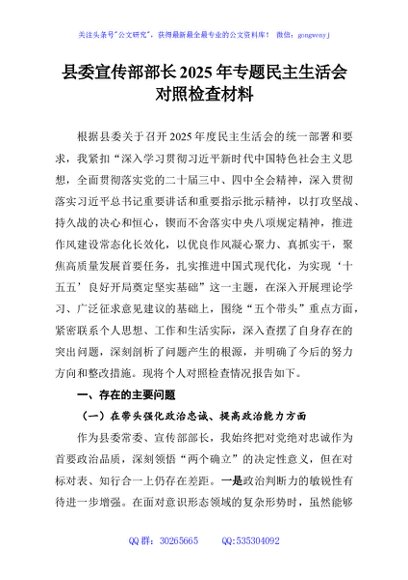 / 县委宣传部部长2025年专题民主生活会对照检查材料