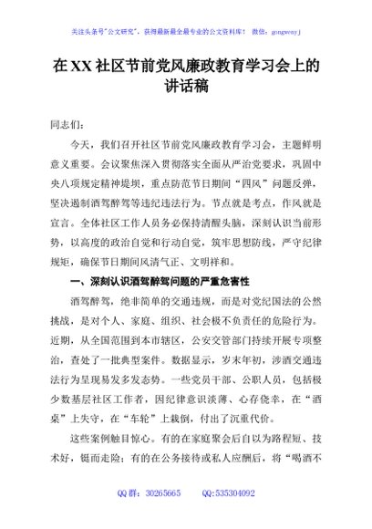 / 在XX社区节前党风廉政教育学习会上的讲话稿