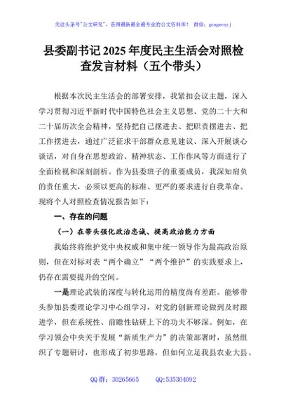 / 县委副书记2025年度民主生活会对照检查发言材料(五个带头)