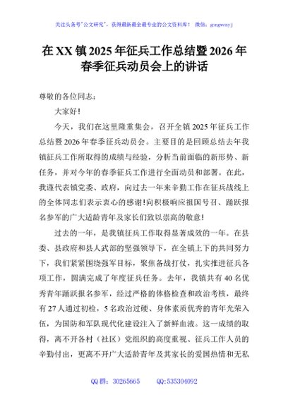 / 在XX镇2025年征兵工作总结暨2026年春季征兵动员会上的讲话