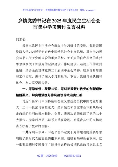 / 乡镇党委书记在2025年度民主生活会会前集中学习研讨发言材料