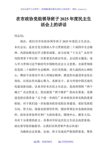 / 在市政协党组领导班子2025年度民主生活会上的讲话