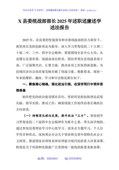 / X县委统战部部长2025年述职述廉述学述法报告