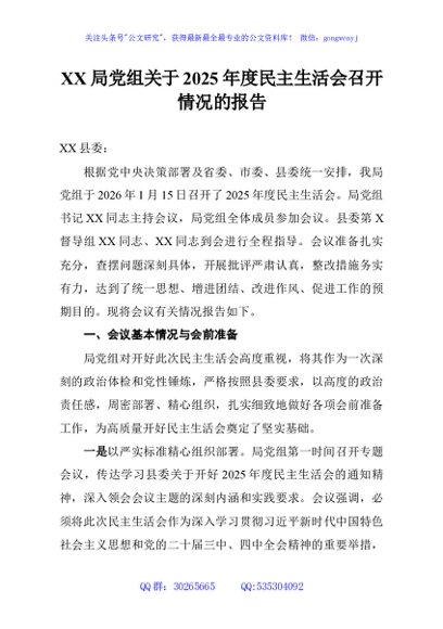 / XX局党组关于2025年度民主生活会召开情况的报告