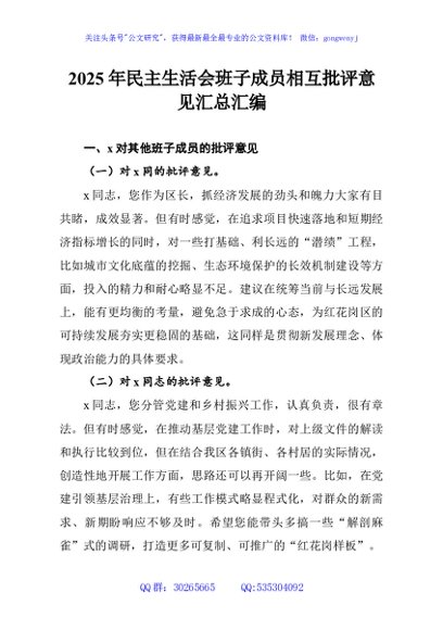 / 2025年民主生活会班子成员相互批评意见汇总汇编
