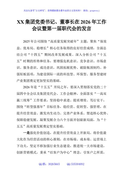 / XX集团党委书记、董事长在2026年工作会议暨第一届职代会的发言