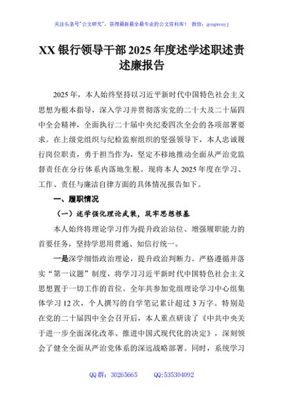 / XX银行领导干部2025年度述学述职述责述廉报告