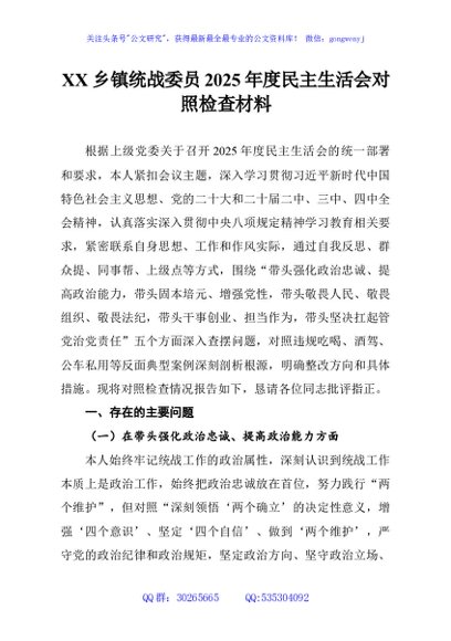 / XX乡镇统战委员2025年度民主生活会对照检查材料