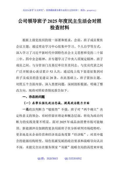 / 公司领导班子2025年度民主生活会对照检查材料