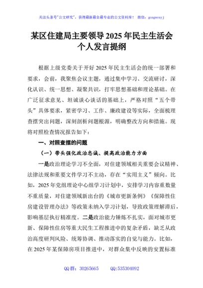 / 某区住建局主要领导2025年民主生活会个人发言提纲