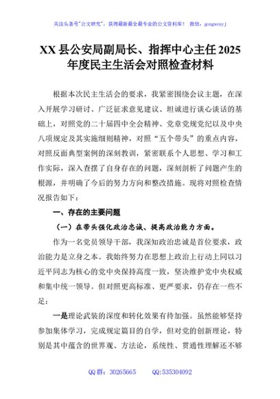 / XX县公安局副局长、指挥中心主任2025年度民主生活会对照检查材料