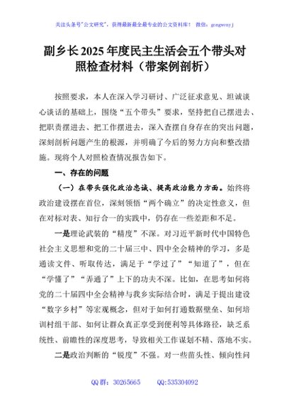 / 副乡长2025年度民主生活会五个带头对照检查材料(带案例剖析)