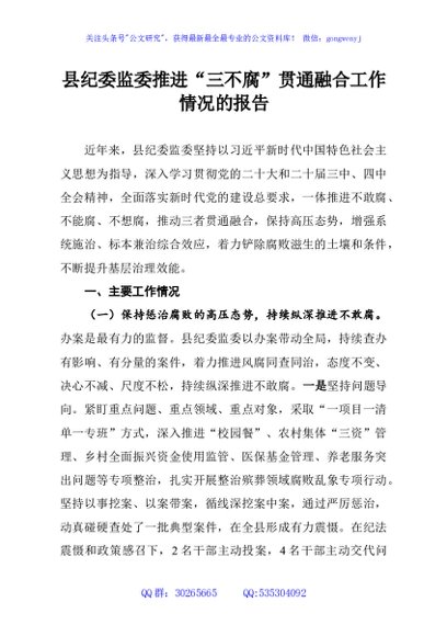 / 县纪委监委推进“三不腐”贯通融合工作情况的报告