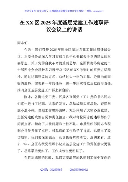 / 在XX区2025年度基层党建工作述职评议会议上的讲话