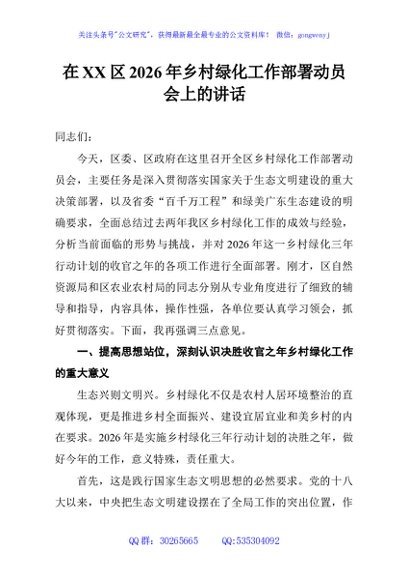 / 在XX区2026年乡村绿化工作部署动员会上的讲话