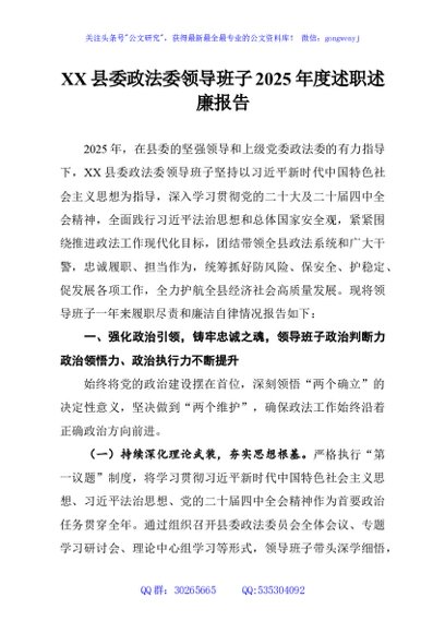 / XX县委政法委领导班子2025年度述职述廉报告