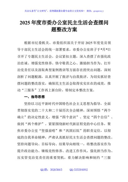 / 2025年度市委办公室民主生活会查摆问题整改方案