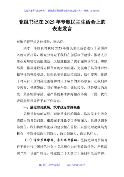 / 党组书记在2025年专题民主生活会上的表态发言
