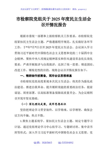 / 市检察院党组关于2025年度民主生活会召开情况报告