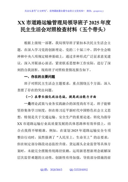 / XX市道路运输管理局领导班子2025年度民主生活会对照检查材料(五个带头)