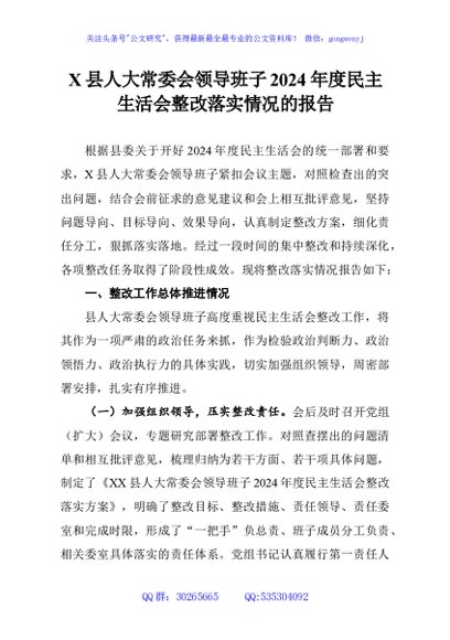 / X县人大常委会领导班子2024年度民主生活会整改落实情况的报告
