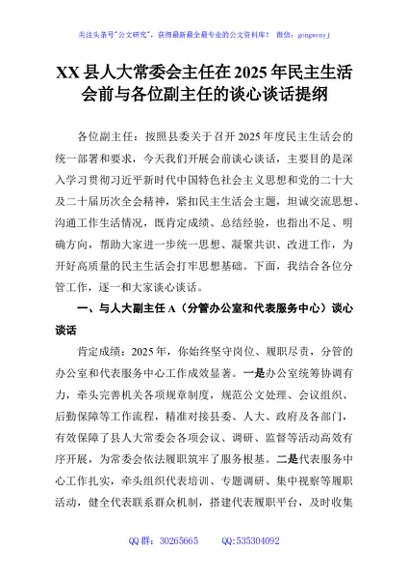 / XX县人大常委会主任在2025年民主生活会前与各位副主任的谈心谈话提纲