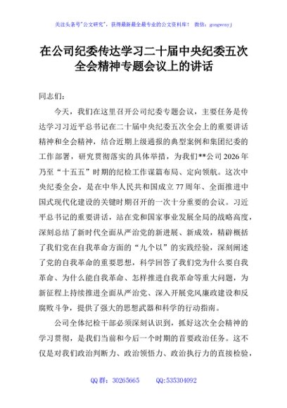 / 在公司纪委传达学习二十届中央纪委五次全会精神专题会议上的讲话