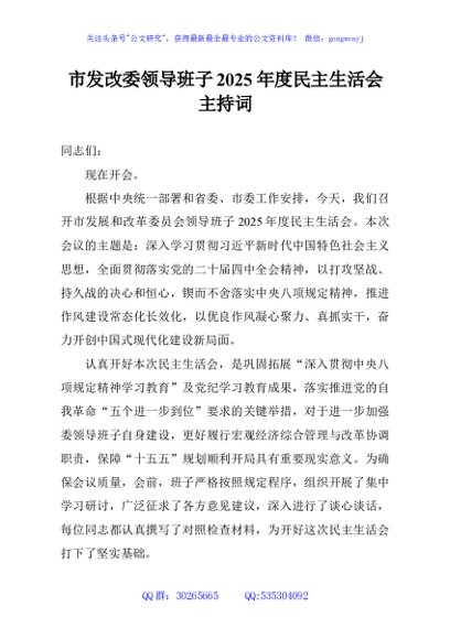 / 市发改委领导班子2025年度民主生活会主持词