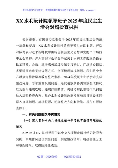 / XX水利设计院领导班子2025年度民主生活会对照检查材料