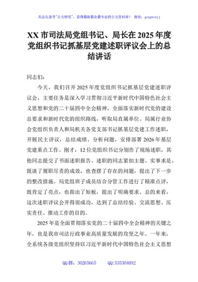 / XX市司法局党组书记、局长在2025年度党组织书记抓基层党建述职评议会上的总结讲话