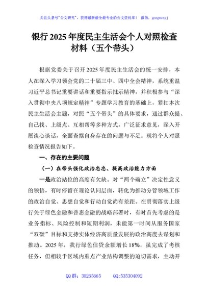 / 银行2025年度民主生活会个人对照检查材料(五个带头)